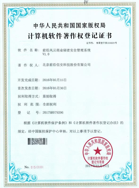 软件著作权证书--前沿风云商业秘密安全管理系统V1.0