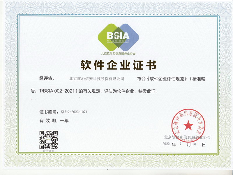 北京软件和信息服务业协会”软件产品证书 “--前沿数据防泄漏系统